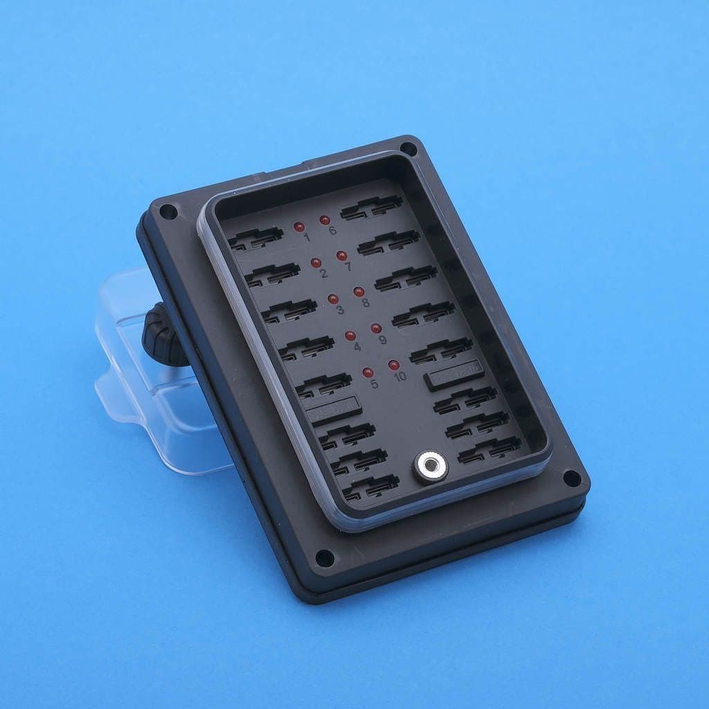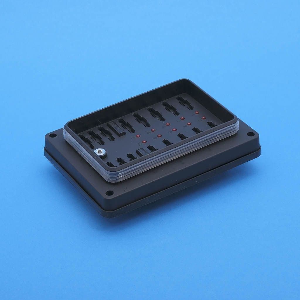 10 way blown fuse indicating fuse box for mounting on a flat panel. Clear screw down cover with silicon seal and rubber gasket between the base and mounting panel. Space is proviced within the cover for 6 spare fuses. All connections are independant with 6.3mm spade terminals.
